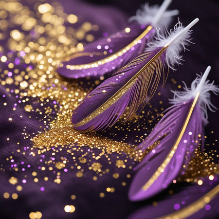 Three purple feathers with gold accents and white tips rest on a dark fabric scattered with gold and purple glitter and bokeh lights.