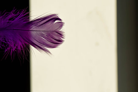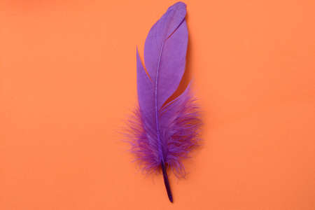 A detailed macro image showcases a feather with a blend of colors, transitioning from purple to orange. The soft, textured surface is highlighted by diffused lighting. The composition focuses on the fine details of the feather against a smooth background. This image could be used for various design projects.