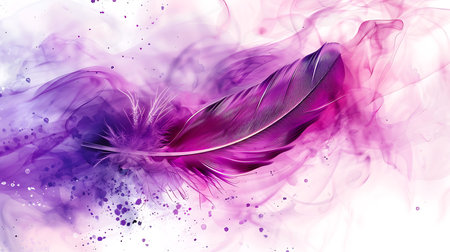 A vibrant blend of purple and pink hues fills the background, featuring delicate feather and floral patterns that create a calming and dreamy effect, ideal for creative designs.