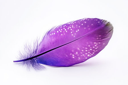 A rich purple feather with soft edges and intricate details, gently floating against the white backdrop.
