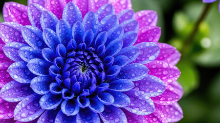 Close-up of a vibrant purple chrysanthemum flower with delicate droplets of water on its petals, showcasing intricate details and natural beauty.