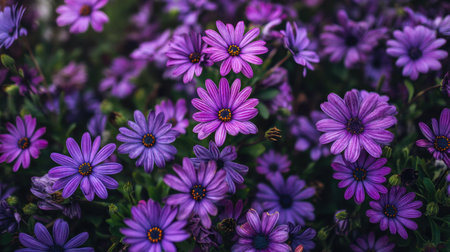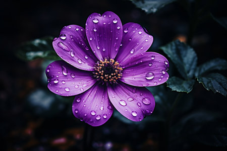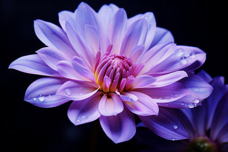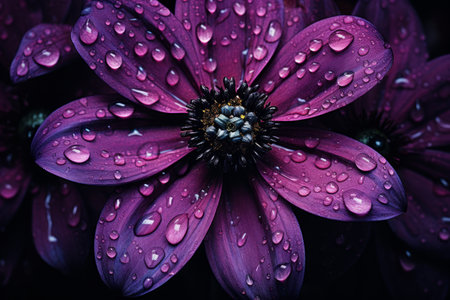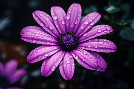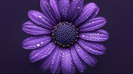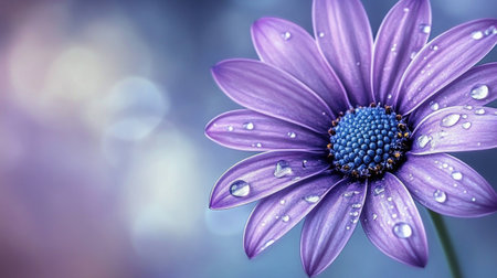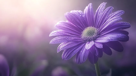 Stunning close up featuring a purple daisy flower with dewdrops on its petals, set against a soft, blurred background. The image captures the beauty and freshness of nature.