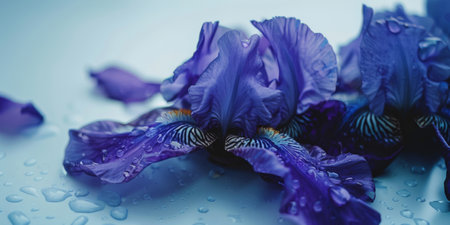 Delicate Blue Irises Wilting Elegantly with Water Drops.
