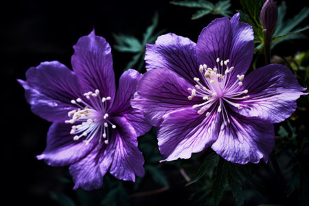 A stunning arrangement of vibrant purple bougainvillea blossoms set against a dark backdrop. This closeup captures the intricate details and textures of each petal, highlighting the beauty of nature.