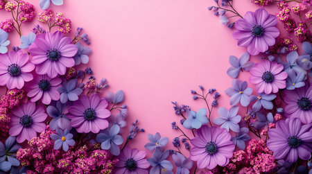 Purple flowers arranged on a pink background, forming a vibrant floral frame