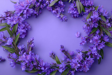 Circular arrangement of vibrant purple flowers with green leaves, creating a beautiful floral wreath on a solid purple background. The flowers and leaves are arranged in a circle, with the flowers densely clustered and petals showing various shades of purple. The flat lay presentation displays the floral detail clearly, with subtle variations in flower depth.