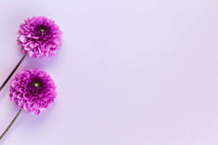Amazing violet Dahlia flowers on a pink pastel background. Flat lay. Place for text.