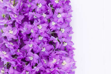 Frame made of lilac delphinium flowers on a white plank background. Top view, copy space.