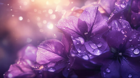 A stunning close-up of purple flowers adorned with glistening water droplets. The soft lighting creates a beautiful bokeh effect, adding a serene ambiance.