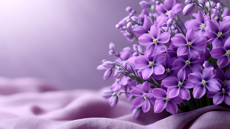 Beautiful bouquet of spring flowers on purple cloth, closeup