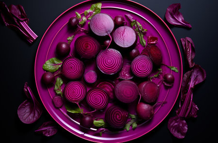 A visually appealing arrangement of vibrant purple vegetables including sliced beets and whole and sliced eggplants, artfully displayed on a dark background.