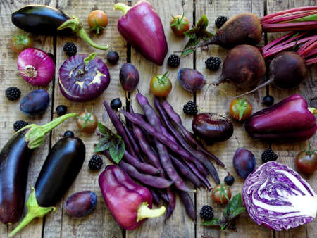purple vegetables and fruits on wooden background - eggplant, cauliflower, green beans, cherry tomatoes, plum, basil, onion, cabbage, sweet pepper
