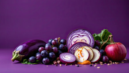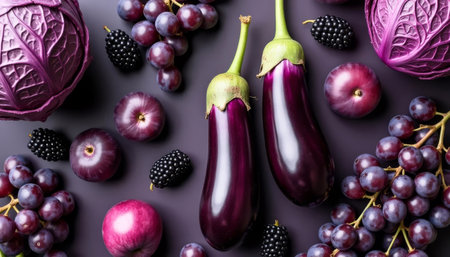 A stunning colorful arrangement featuring fresh vegetables and fruits, including eggplant, red cabbage, and grapes, against a rich purple backdrop, emphasizing healthy eating.