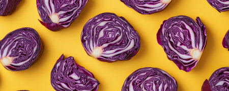Sliced red cabbage on yellow background, top view. Healthy food and nutrition concept