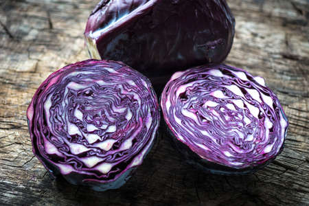 red cabbage half and slice on wooden.