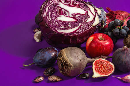 Blue, red and purple food. Culinary background of fruits and vegetables. Fresh figs, plums, onions, eggplant, grapes, cabbage, apples, garlic, dogwood, pomegranate. Violet background, trendy hard light