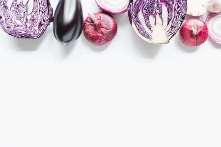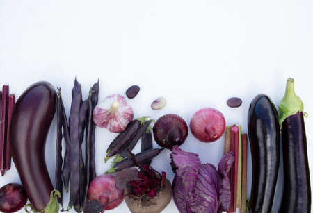 Collection of fresh purple vegetables on a white background with space for text. Banner, poster.