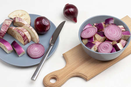 Chopped eggplant and chopped violet onions in bowl and on cutting board. Sliced eggplant and knife on plate. Top view. White background.