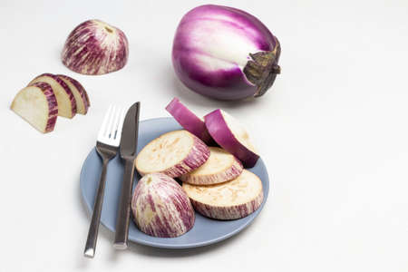 Purple and striped sliced eggplant, fork and knife on gray plate. Whole purple eggplant with dry leaves. Copy space. Top view. White background.