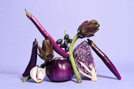 An artistic set of purple vegetables and fruits, including cabbage, eggplants, grapes, and onions, set against a vivid purple background. Perfect for concepts like color, health, organic food