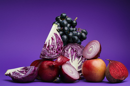 close-up view of grapes, apple, beetroot, onions and sliced cabbage on purple