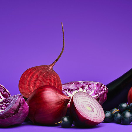 A still life composition featuring red onions, radishes, and red cabbage against a solid purple backdrop.