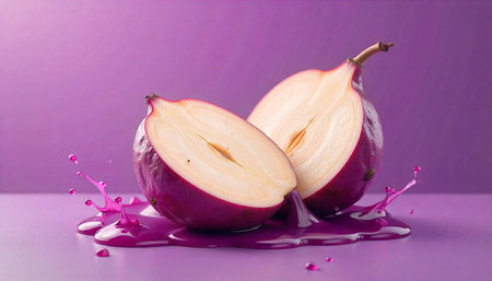Halved pears with juice splash on a monochromatic background