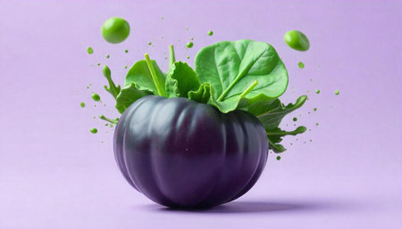 A dark eggplant with green spinach leaves and splash