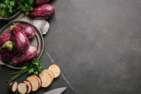 Composition with fresh eggplants on dark background
