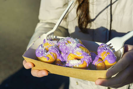 Raw fresh eggplant on violet background. Concept of green house life style and products of subsistence farming, flat lay, copy space