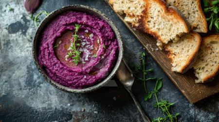 Delight in a vibrant bowl of creamy purple hummus elegantly presented with crispy bread. This culinary masterpiece showcases freshness, flavor, and health. Perfect for sharing!