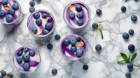 Blueberry yogurt with fresh berries in glassle background, top view