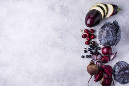 Assortment of fresh purple fruits and vegetables on a dark purple background. Healthy food.