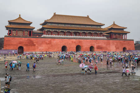 Beijing, China - circa September 2015: Tourists in Forbidden Palace on the rainy day, Beijing, China