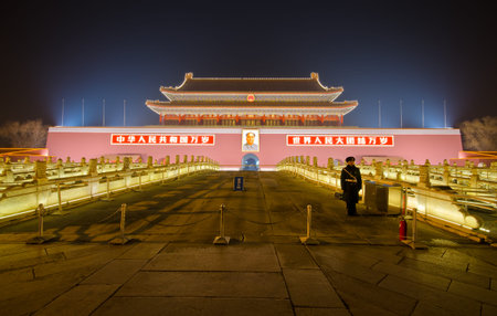 BEIJING - FEB 20: Soldier standing against Forbidden City southern gate at night on February 20, 2012 in Beijing, China. The balcony with Mao's portrait on Tian-An-Men square is a symbol of China.