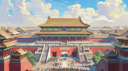 Panoramic view of Taihe Gate complex in Beijing's Forbidden City, showingcasing imperial architecture and ancient Chinese heritage.