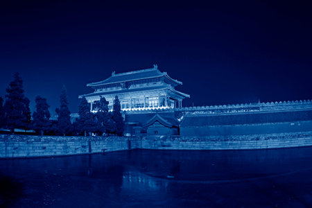 Beijing, China-October 4, 2020: Night scenery of the Wumen wall of the Forbidden City in Beijing
