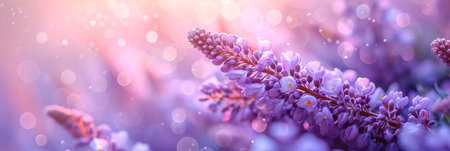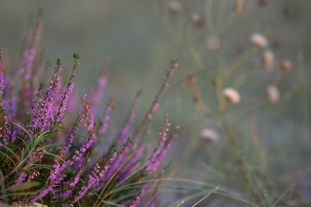Close up pink heather flowers on a blurry background. Selective focus blooming heather flowers bush in sunset light. Natural spring background. Copy space.
