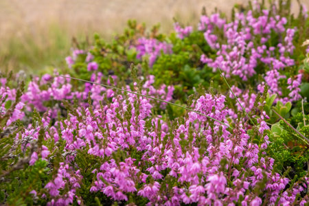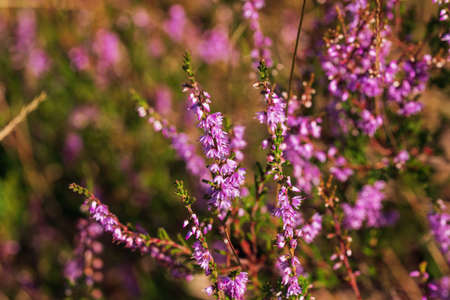 Purple pink common heather (Calluna vulgaris). Landscape plants heather. Colorful traditional October european flower. selective focus