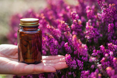 Herbal medicine, phytotherapy - pink heaths flower and herbal tablets. PILLS in brown glass.