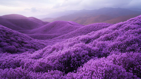 A serene lavender landscape showcases a soft purple hue during dusk, with misty mountains in the background and a winding pathway inviting exploration.