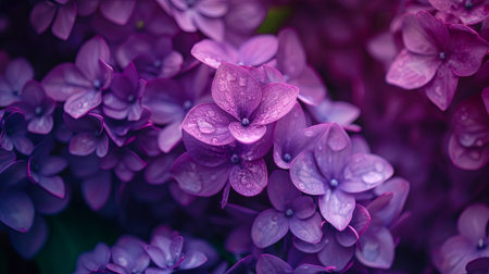 Breathtaking close-up of vibrant purple flowers, petals glistening with morning dew. A mesmerizing display of nature delicate beauty. Perfect for art and nature lovers. Generated A.I.