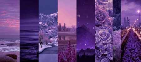 A captivating collage showcasing diverse purple landscapes, from tranquil ocean waves to vibrant flowers and majestic mountains, blending nature with urban elements, AI generated