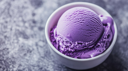 A delightful scoop of creamy purple ice cream presented in a white bowl, set against a textured gray surface, perfect for enticing dessert lovers.