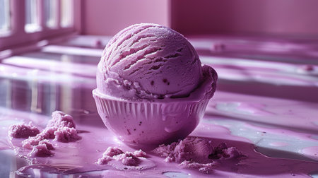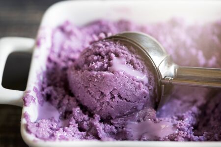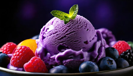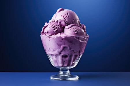 Delicious scoop of purple ice cream with creamy texture captured up close in a dessert setting at twilight