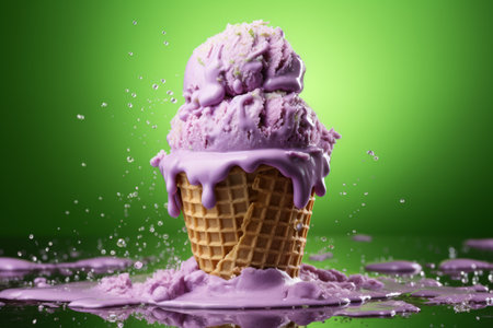 Melting purple ice cream on a green background. Summer minimalism. generative AI