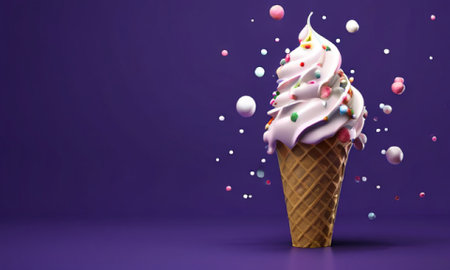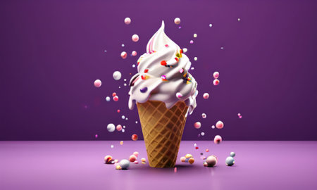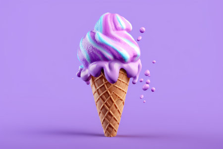 3d render of ice cream in waffle cone on violet background