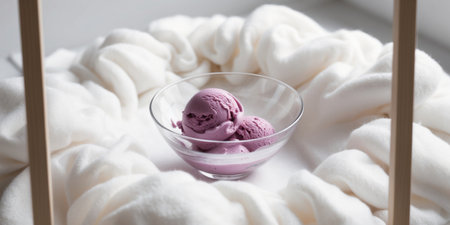 AI Generated. Blueberry ice cream in a delicate glass bowl on cloud like cotton setting