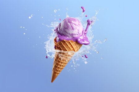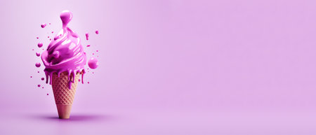 Purple ice cream cone with swirl splash. Ads promo poster with icecream in waffle cup with splashing sauce. Sweet creamy dessert, dairy frozen summer dessert. Copy space. AI generated.