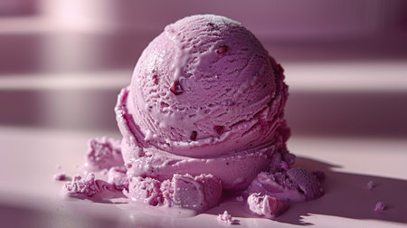Close-up studio shot reveals a smooth, textured lavender ice cream surface. A round scoop lies atop, creating an appetizing abstract art from delicious frozen food.